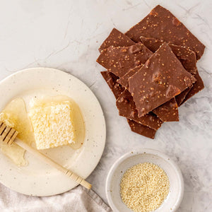 A delicate balance of sweet and savoury, this bark is made with 34% milk couverture chocolate scattered with crunchy Manuka honeycomb pieces & earthy toasted white sesame. Each bite offers a rich, decadent, flavour profile that will keep you coming back for more. MOREISH!