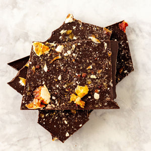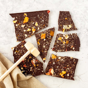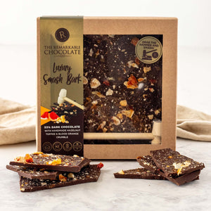 Our Smash Bark is not just chocolate, it’s an experience! Each block comes with its own wooden hammer so you can smash, crack, and share the fun. This one is made with rich 53% dark couverture chocolate, layered with crunchy hazelnut toffee and topped with tangy blood orange crumble for a sweet-zesty twist. Perfect for gifting, sharing, or adding a little theatre to your chocolate indulgence.