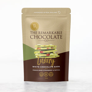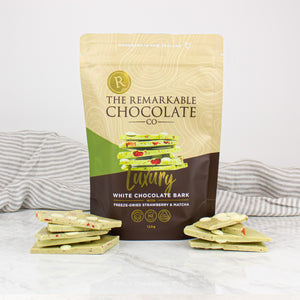 Made with smooth 28% white couverture chocolate, capturing the cosy comfort of a strawberry matcha latte. Swirled with the earthy warmth of matcha & topped with vibrant freeze-dried strawberries, it’s a creamy, café-inspired treat with a fruity twist. DREAMY!